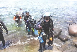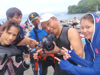 5/31☆大瀬崎2ビーチ 海ログ 2009.06.01 昨日もマンボウ撃沈です 水中は透明度は落ちてしまって見渡せる感じではなかったです すこし流れもあったので水底近くを泳いでいたおかげでヒラタエイが たくさん見られました生物はベニカエルアンコウ、マツカサウオのチビ サクラダイ、シラコダイ、ヤマドリ、など。 今回EOS 50Dを初使用のユウゾウさんを囲んで記念撮影です これからじゃんじゃん撮りまくって下さいませ メンバー全員のポートレート写真集は『かおりっくすTODAY』をご覧下さい