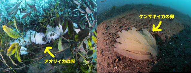 ケンサキイカの卵でしょうか。産卵して時間が経っていないようで、まだ卵がつぶつぶの真ん丸です。なんと!!この卵がだんだん成長してイカの形になってくるんですよ~~!
