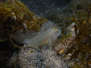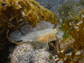 帰りがけに、ロープの海藻に極小のほんのり黄色がかったカエルアンコウの幼魚を発見