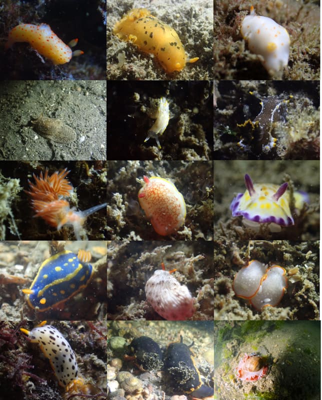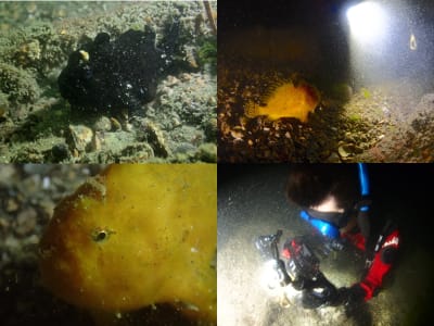 アカボシウミウシ、クロシタナシウミウシ、シラユキウミウシ、ウミフクロウ、コトヒメウミウシ、クロコソデウミウシ、アカエラミノウミウシ、サラサウミウシ、コモンウミウシ、アオウミウシ、オトメウミウシ、ミツイラメリウミウシ、シロウミウシ、ミスガイ、ゴマフビロードウミウシ、フタスジミノウミウシ、フジエラミノウミウシ、シロイバラウミウシ、クロイバラウミウシ、アカキセワタ、ツヅレウミウシ、ヤマトウミウシ、ベッコウヒカリウミウシ、カエルアンコウ×3、アイナメ、マダコなど。今回は生物写真全てご提供頂きました。ありがとうございました!!!!!