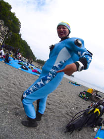 ふなっしーカラーのビーニー&カモ柄スーツが似合っております