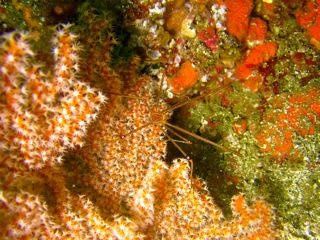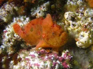 岩場には、ベニカエルアンコウが、トサカの陰に隠れていました。