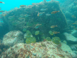 スズメダイやアカカマス、イサキ、メアジが川のように群れています