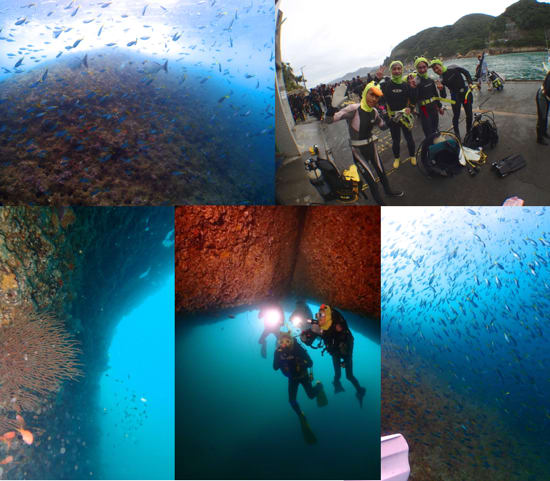 なんと下に行けばいくほど水が冷たく、透明度が悪くなってました水深8mあたりから急に水温が上がって青い!!タカベやイサキ、カンパチの群れ群れ群れでした!!なぜか洞窟内もやたら上を泳ぐという変なコース取りでしたが