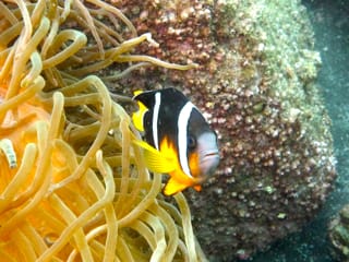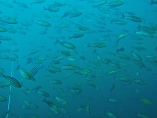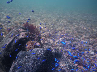 水温は、外海の深場では21℃くらいでしたが、水面は27℃