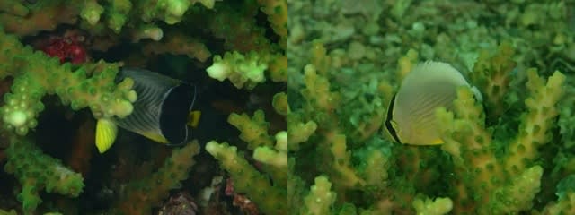 素早い動きで、頭が隠れたり、お尻が隠れたり。 ヤリカタギとミスジチョウチョウウオ。