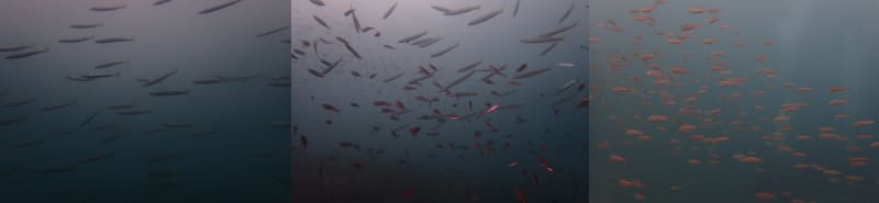 アカカマスやイサキの幼魚の群れが入り交じり、ものすごいことになっていました