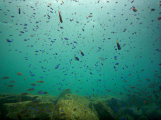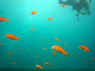 中性浮力を取りながらソラスズメダイやキンギョハナダイの群れを撮ったり、