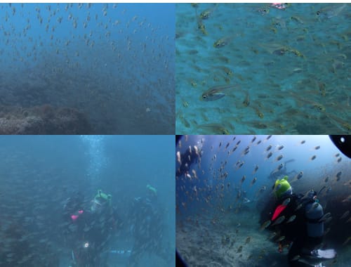 イサキ、スズメダイ、ソラスズメダイの群れが入り交じり、まるで水族館のようです