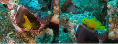 そしてその近くのフジツボの中には、お腹の大きなミジンベニハゼが警戒しながらこちらを覗いていました