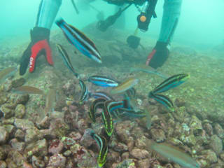 じっと止まって講習しているとアジやスズメダイ、イシダイの子供