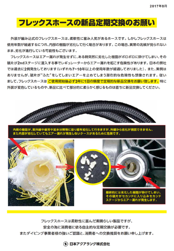 交換の時期に関しては、日本スクーバ協会よりご購入から2~5年の期間内の定期的なホース交換が推奨されています。