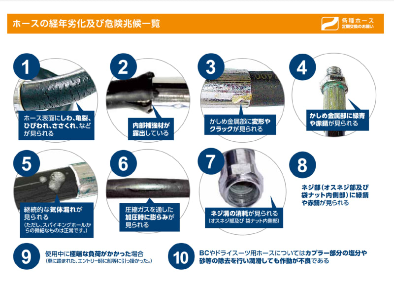下記のような症状が確認できた場合は、ホース交換をされてからダイビングを行ってください。心配な方はお持ちいただければ、点検させて頂いております。